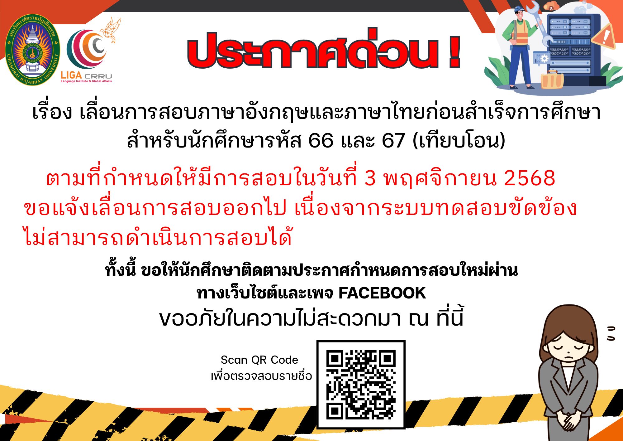 เรื่อง เลื่อนการสอบภาษาอังกฤษและภาษาไทยก่อนสำเร็จการศึกษา สำหรับนักศึกษารหัส 66 และ 67 (เทียบโอน)